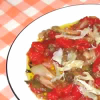 3. Se juntan todas en una fuente y se añade el bacalao cortado a tiras.